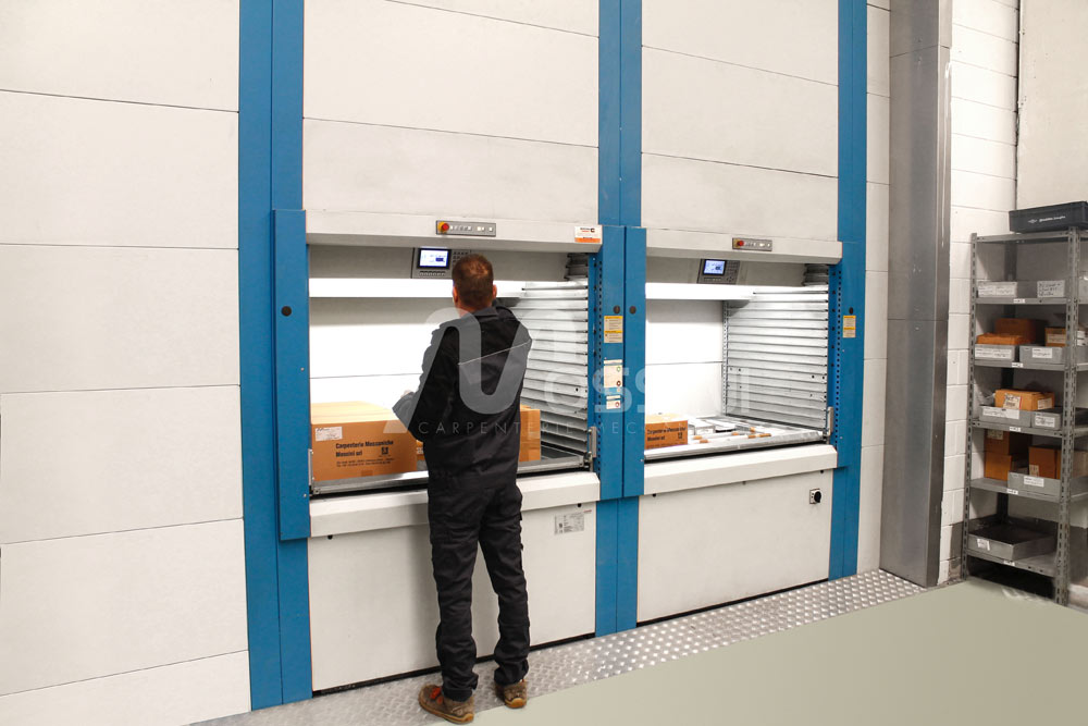 Oltre ai tradizionali sistemi di immagazzinamento e gestione dei materiali in ingresso sono presenti in azienda 1 magazzino automatico a rotazione e 1 magazzino a mappature variabili con 2 isole di prelievo , che permettono un rapido accesso ai prodotti.